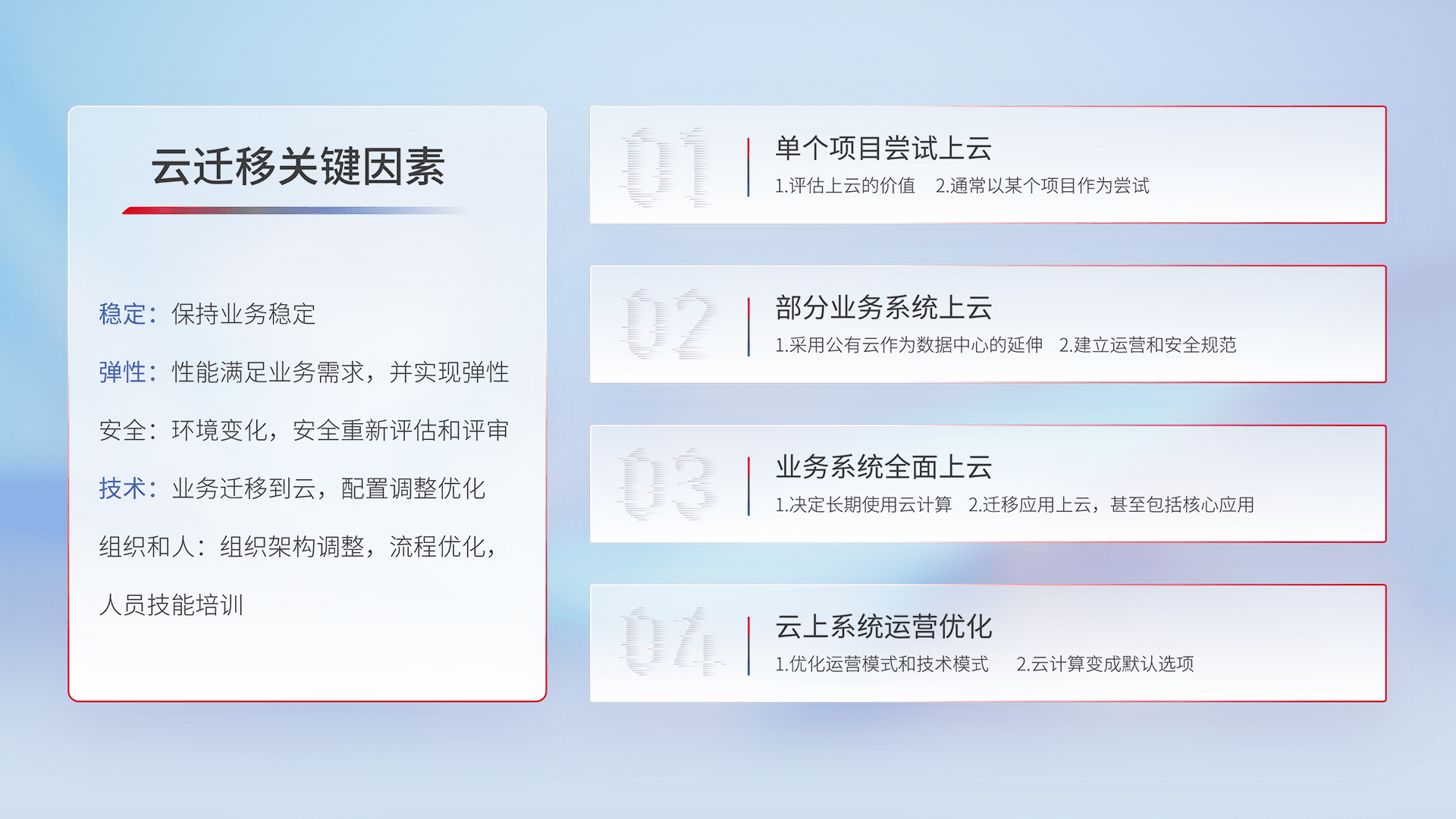 结合实际业务,,,从规划设计、、、云平台选型、、、云原生改造、、、、数据迁移、、、、集成交付,,迁移全过程为客户识别最佳上云路径,,,做好风险识别管理,,,设计网络架构、、、身份权限、、、、安全审计合规、、、、操作审计、、、、日志审计、、、、监控告警策略、、、、多站点容灾设计等,,对云上基础设施进行整体规划,,,提升IT治理水平,,以满足弹性、、高可用、、、、高性能的需求。。。。