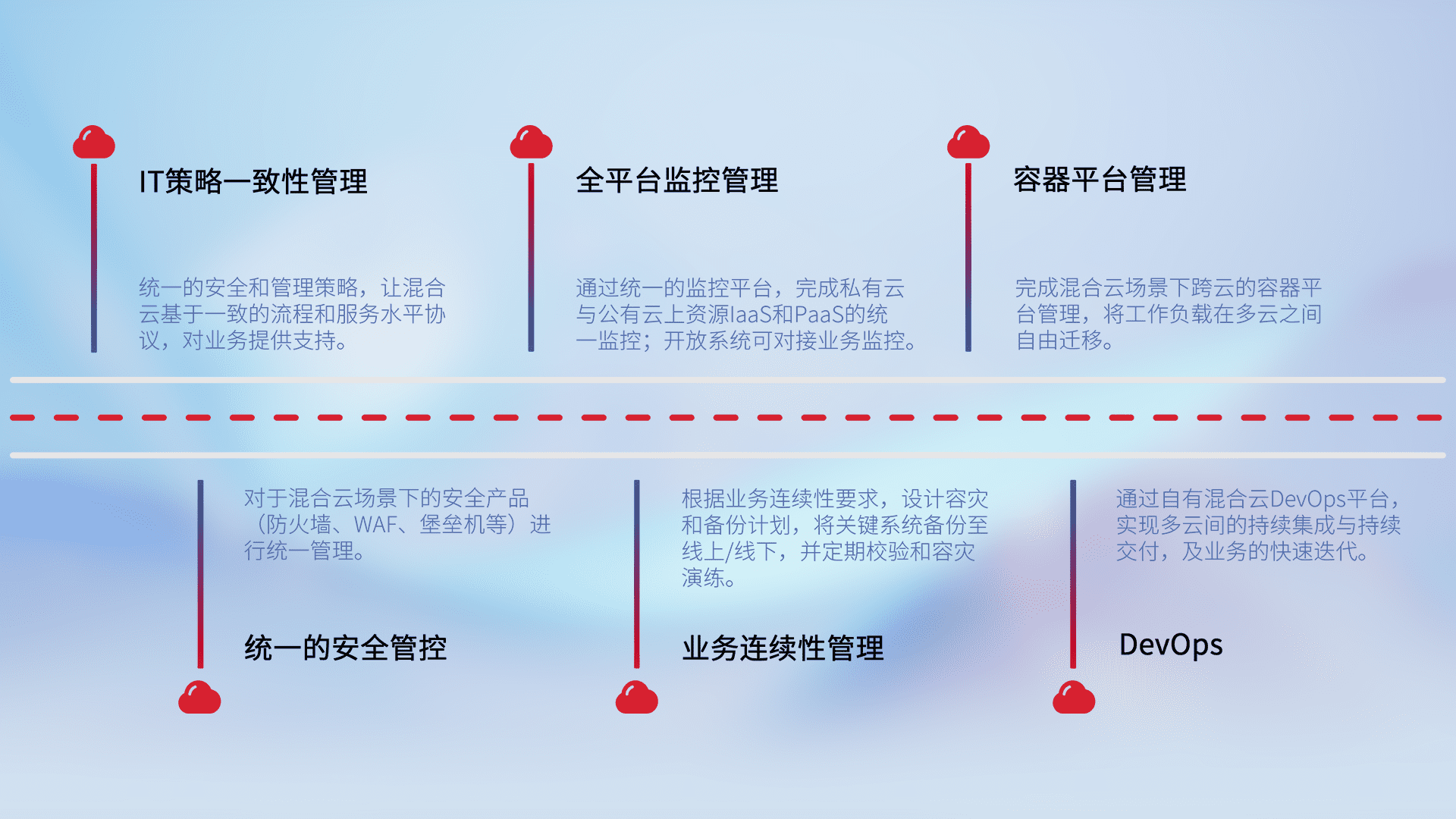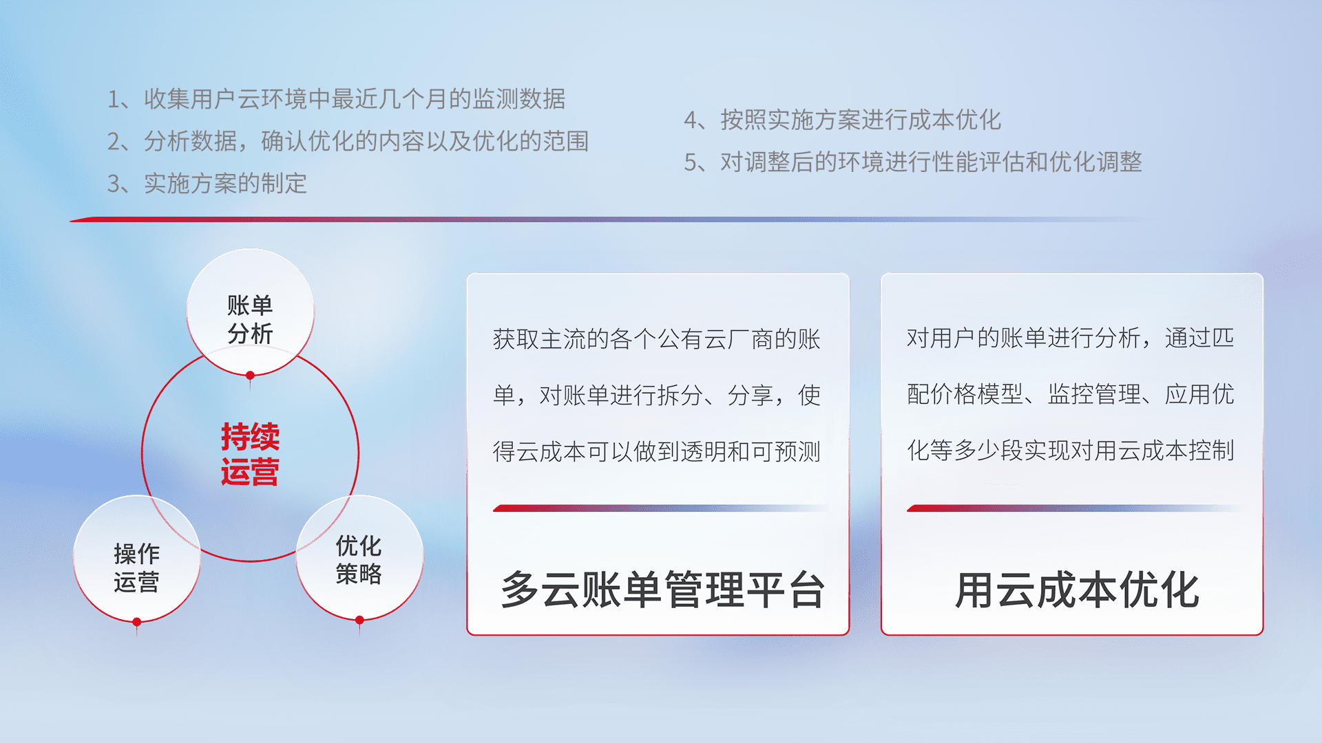 通过多云纳管,,,,以统一的资源数据模型把客户的云资源进行抽象和封装,,,进而实现对多云资源的统一操作,,,,保障云资源管理的可靠性、、、、稳定性与可用性。。。。量身定制化运维内容,,配置、、、开发运维、、、、补丁管理、、、备份、、、监控、、认证和访问管理、、、审计和日常巡检等,,保障在用云过程中的可靠度,,,,稳定度以及高可用率。。。