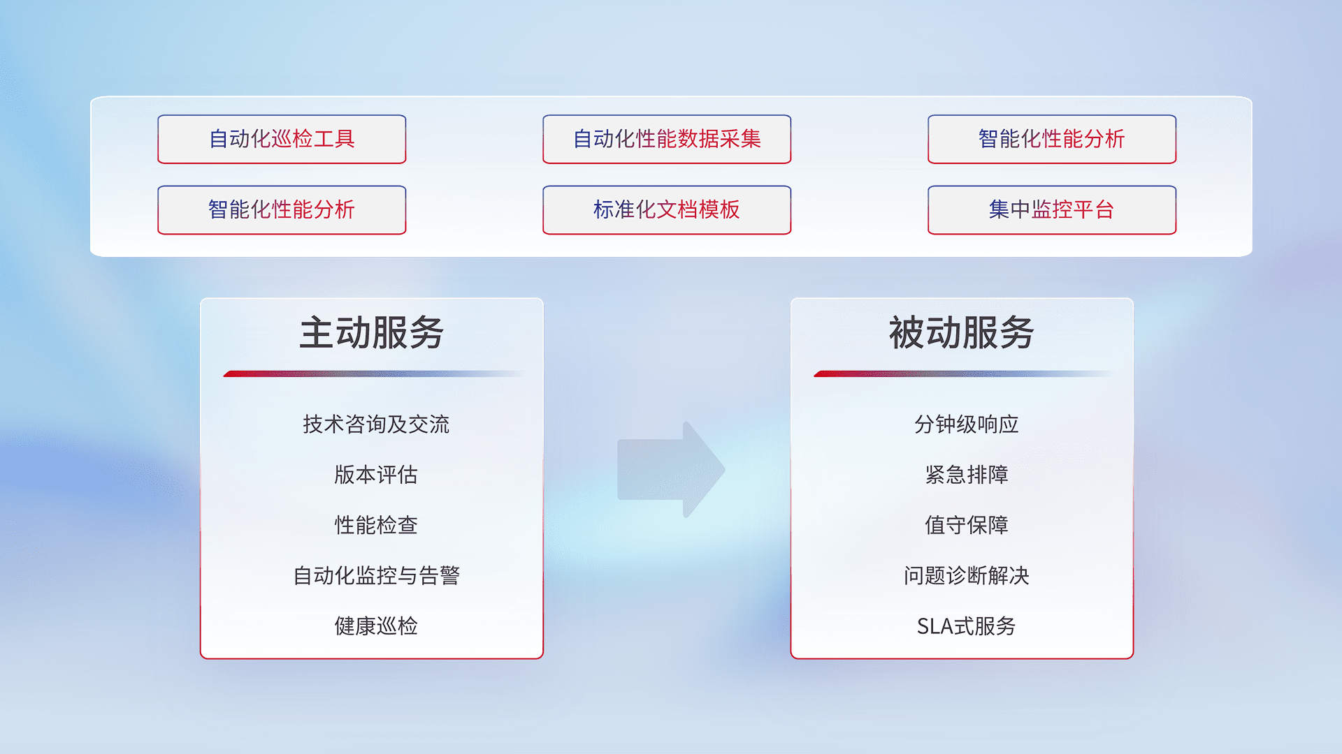 智能化工具和标准化文档,,保障服务质量,,,,提供主动服务(包含技术咨询、、、版本评估、、、、性能检查、、、自动化监控与告警、、、健康巡检)和被动服务包含(分钟级响应、、、、紧急排障、、、、值守保障、、、、问题诊断解决、、、、SLA服务)。。